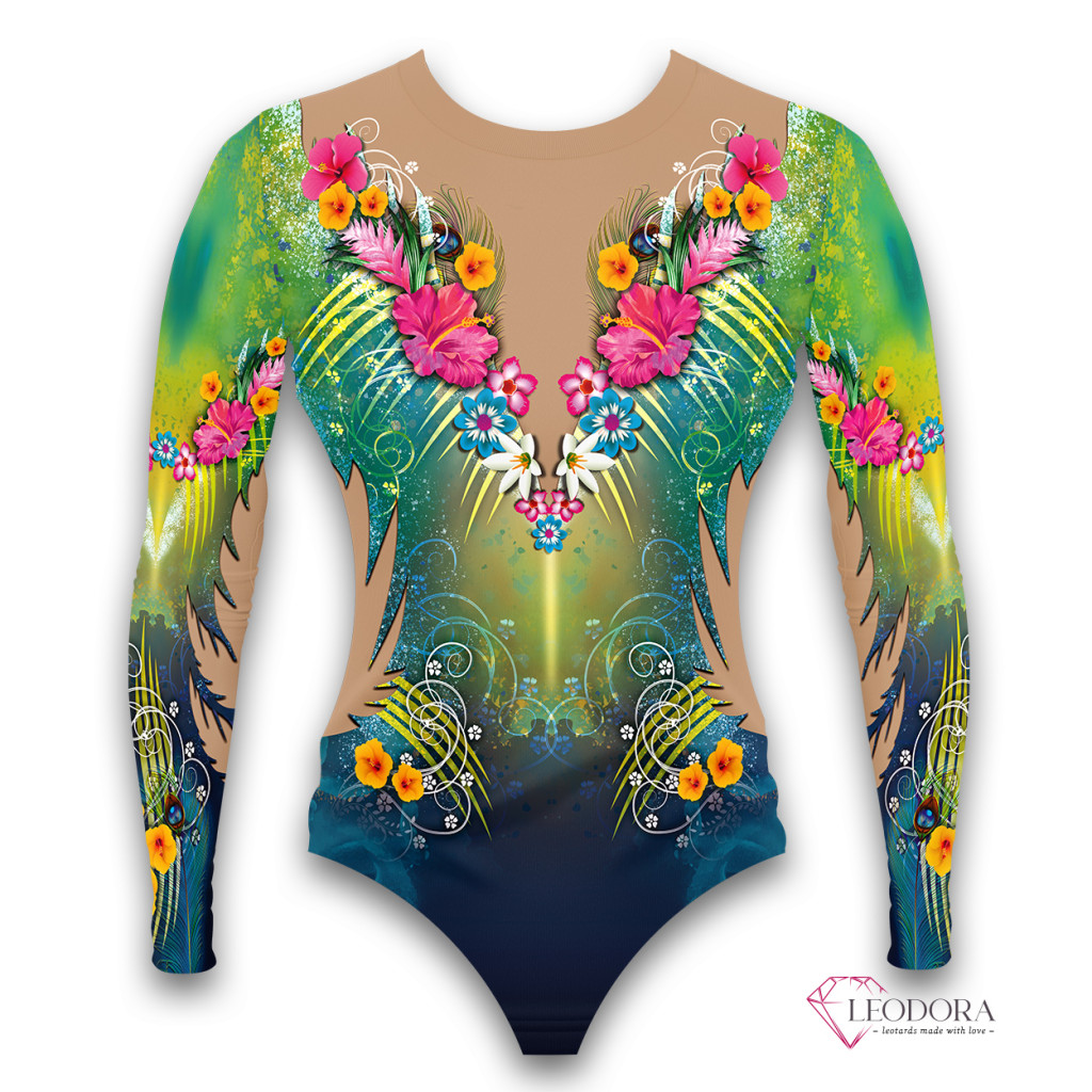Vibrant tropical hues and vivid floral patterns burst with energy and rhythm. The joyful composition celebrates color, motion, and confidence on stage.